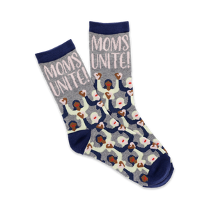 Moms Unite Socks: Dedicated to the Unbreakable Bond of Motherhood Dive into a world of unity and solidarity with our Moms Unite Socks. These vibrant socks, adorned with the words "Moms Unite" and a captivating pattern of women of various ethnicities raising their arms in unity, are a testament to the unwavering bond of motherhood. Each sock features a blue band at the top, adding a touch of elegance. Slip into a pair of these crew-length socks and celebrate the extraordinary power of mothers everywhere.