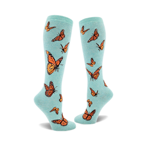 Flit, flutter, and flaunt these delightful Monarch Butterfly knee-high socks! Wrapped in a swarm of vibrant dark orange butterflies darting across a sky-blue backdrop, these socks are a perfect blend of whimsy and charm. Whether you're a nature lover looking for a wardrobe flourish or seeking the ideal accessory for a garden party, these socks are your ticket to compliments. Perfect for brightening up mundane office attire or adding a playful twist to your weekend getup. Why blend in when you were born to stand out with these eye-catching beauties?