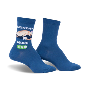 Get yourself some Monday Mode, On socks and see if you don't feel motivated even when it's the worst day of the week. Well, that's if you can stay awake long enough to get dressed! The socks are blue, and they feature a cute cat sleeping on a coffee cup. The words "Monday Mode, On" are printed in bold text above and below the picture. And if the kitty doesn't get you going, the caffeine will!
