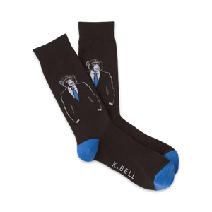 Why do you always have such a chimp on your shoulder? Maybe you need a cool new pair of socks to match that suit of yours. This funny pair of black and blue crew socks features a business chimp in a classy suit. Don't be a run of the mill monkey when you can be a CHIMPion!