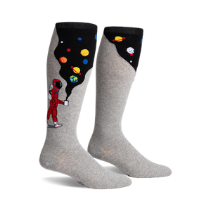 These socks are light grey with a black cuff that curves down, giving a glimpse into deep space. On one side, a little astronaut in a red suit and white sneakers is casually strolling along the grey base, holding something that looks like a tiny universe-making tool. From it, a stream of black rises, bursting into colorful planets - you can see a ringed one, a swirly blue-green one, a bright yellow sphere, and more little dots of light. It's like they're just taking a relaxed morning walk, creating the cosmos as they go. Perfect for anyone who likes their daily routine with a side of cosmic wonder.