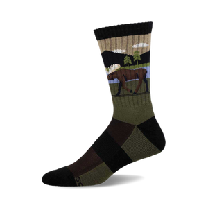 The moose, with its majestic antlers and serene presence, is a symbol of quiet strength in the wild. Our green, black, and brown socks capture this essence perfectly, featuring a moose design set against a stunning mountain backdrop. Slip these on and channel the calm resilience of the mighty moose as you navigate your daily adventures with grace and balance.
