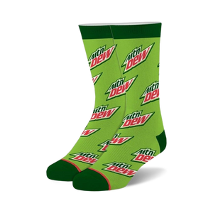 Unleash Your Mountain Dew Obsession with These All Over Crew Socks! Dive into the invigorating world of Mountain Dew with our electric green socks, adorned with a vibrant pattern of white and red Mountain Dew logos. These socks are the perfect pick for the ultimate Mountain Dew fan who wants to add a splash of flavor to their everyday style. Whether you're a citrus-loving adventurer or just someone who appreciates a bold design, these Mountain Dew All Over Crew Socks are a must-have for your sock collection.