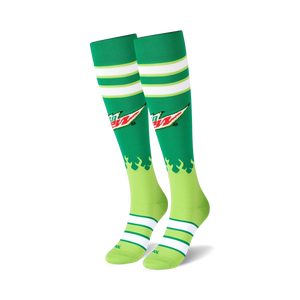 Meet Mountain Dew, the knee-high socks that will quench your thirst for rad style! With a crisp white stripe and a white toe, these green socks feature the iconic Mountain Dew logo with flames blazing out, daring you to unleash your wild side. They're a surefire way to turn heads wherever you go, whether you're hitting the streets, the slopes, or the couch. So why wait? Grab a pair of Mountain Dew socks today and let the adventure begin!