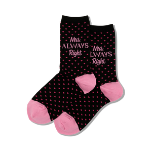 Mrs. Always Right Socks: The perfect gift for a special lady! These playful and fun socks feature a vivid pink polka dot pattern, the text "Mrs. Always Right" embroidered lovingly along the leg, and a vibrant pink toe and heel. An attention-grabbing gift that shows your appreciation for the resilient power of womankind. Step into these socks and show the world who wears the pants in the house!