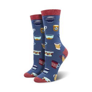 Blue bamboo socks with a fun pattern of coffee mugs. Sip your morning pick-me-up in style with these socks! They'll add a touch of whimsy to your everyday attire. Perfect for coffee lovers and tea drinkers alike!