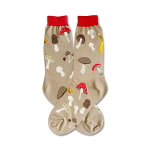 Step into a world of whimsy and wonder with our Mushroom Fungi Crew Socks designed for women! With their light tan base and vibrant all-over mushroom pattern in shades of brown, red, yellow, and white, these socks will have you feeling earthy and fabulous. Whether you're a nature lover or just love quirky fashion, don't miss out on these fun and fashionable footwear.