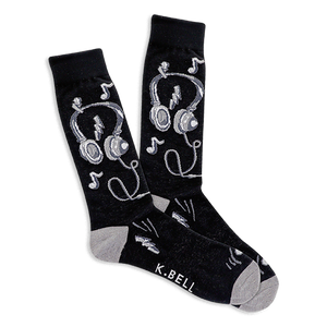 Tune into your day with socks that hit all the right notes. These black crew socks feature a cool design of white and gray headphones, complete with a visible cord, for that classic listening vibe. Musical notes float around the headphones, along with some jagged lightning bolt shapes that add an energetic pop. The heels and toes are a contrasting light gray, tying the look together nicely. They are perfect for anyone who loves good music and wants to show it off, casually and comfortably.