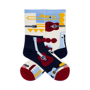 Some say these socks make great music. They've got a beautiful bold funky pattern of guitars, trumpets, trombones, saxophones, and more in bright colors on a blue background. Put on a pair of Music Retro socks when you need a fun funky reminder of your favorite tunes.