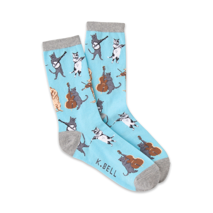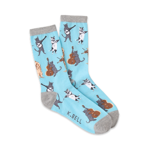 Sock it to me with these funky Musical Cats socks! These light blue crew socks feature a pattern of four cartoon cats jamming away on the tuba, violin, bass, and banjo. Put on a pair of these cool socks and strut your stuff to the beat of your own drum. They're also a great way to show off your love for our feline friends and make a subtle fashion statement wherever you go.
