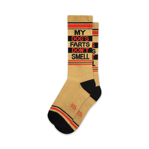 Kick it up a notch with these outrageous, hilarious My Dog's Farts Don't Smell socks. They'll have everyone laughing and questioning the air around you! Made for both men and women, these tan socks boast eye-catching black and red stripes at the top and heels and toes, with a quirky statement written on the front: "My Dog's Farts Don't Smell." Get ready to make a scene wherever you trot!