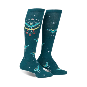 Dive into the mystical world of moths, moons, and stars with these knee-high wonders crafted just for the ladies. These dark teal socks have a dreamy pattern of light blue and green moths with pink details, paired with yellow crescent moons and white stars. They're literally the bomb, or should we say, 'moon'-umental!