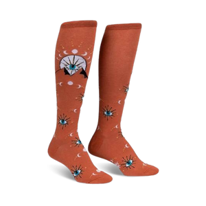 Want socks that keep you looking up at night? These Mystic Mountain socks feature a hypnotic pattern of bright blue eyes, white moons, and yellow stars against an orange backdrop. Wear them and feel the cosmos take you away!
