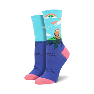 Blast off into a world of whimsy with our Mythical Manners crew socks! Join Bigfoot on his vibrant island adventure, surrounded by crashing waves, fluffy clouds, a dazzling rainbow, and a majestic unicorn. These socks are as captivating as a mythical tale - they'll transport you to a realm where anything is possible. Strut your stuff in these socks, and let your feet do the talking - they're a fashion statement that'll have folks doing a double-take. Get ready to step into a world where myths and legends come to life!