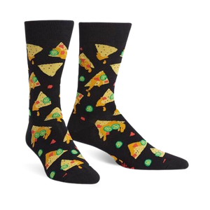 Nacho, Nacho Man - Yeah, yeah, yeah! Who says socks can't be extravagant and fun? For those with a taste for the extreme, we give you the Nacho, Nacho Man crew socks. Nachos aren't just for eating anymore! Picture this: a black sock that shows a unified front of nachos with yellow and red triangles and green circles. And they're topped with a red border, because...why not? Sock on!