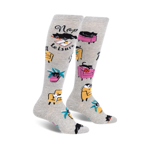 Go from drab to fab with Nap Leisure's knee-high socks. These gray, paw-some socks are covered in black cats lounging on pink and yellow furniture. The comfy cotton blend is perfect for a day of relaxing, while the vibrant colors and quirky design will add a touch of fun to your day. Kick back, relax, and nap in style with a pair of Nap Leisure socks!