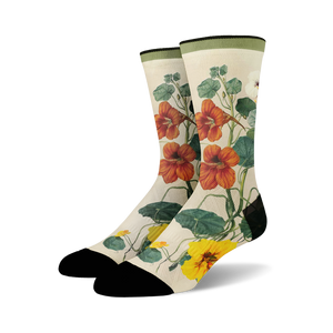 Get ready to cultivate a stunning garden on your feet with our Nasturtium socks! These crew socks bloom with vibrant orange, yellow, and red nasturtium flowers against a backdrop of lush green. Perfect for budding horticulturalists and fashionistas alike, these socks add a touch of nature-inspired flair to any ensemble.