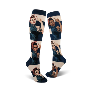 Hey sock fanatics! Gear up for a patriotic fashion statement with our "Nasty Rosie" knee-highs. These white socks rock a blue stripe up top and a red, white, and blue striped pattern down below. Picture this: Rosie the Riveter, the iconic feminist symbol, graces each sock. She's got a blue shirt with the word "Nasty" emblazoned across it, a red bandana in her hair, and her fist raised high. Prepare to turn heads and inspire conversations with every step. Grab yours and show the world your spirited style!