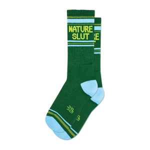 Slip into these forest green socks if you like to keep it real. They feature 'NATURE SLUT' boldly printed in vibrant yellow-green across the calf. You'll also find crisp horizontal stripes in light blue and yellow-green on the ribbed cuff and just below the main text. The heel and toe areas stand out in a soft light blue. On the visible side of the foot, near the arch, a couple of small, abstract yellow-green symbols add a subtle design detail. These socks are ready for whatever adventure you have in mind, from exploring the outdoors to just lounging at home. They're a no-filter vibe for your feet.