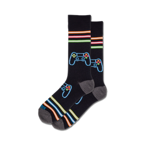 Looking for a colorful way to show off your love of classic gaming? Slip into a pair of Neon Gamer socks and let the good times roll! These crew socks for men boast eye-catching stripes and video game controllers in neon green, pink, orange, and blue. They're sure to make a statement whether you're hitting the arcade, conquering a dungeon, or just hanging with friends. Just beware, these socks might make you the target of playful button-mashing attacks!