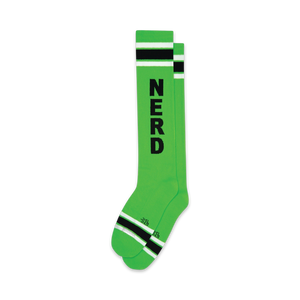 Nerd out in these knee-high socks emblazoned with the word "NERD" in black letters against a bright green background! With two black stripes near the top, these socks are perfect for expressing your inner geek or embracing your quirky side. Available for both men and women, these socks are extra-long for added warmth and comfort. Show off your intelligence and stand out from the crowd with these fun and stylish socks!