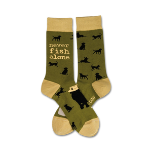 Never Fish Alone: Socks that are as loyal and fun-loving as your best furry friend! These olive green socks feature a pattern of black dogs in different poses. On the left sock, you'll find the encouraging words "Never Fish Alone" in cheerful yellow text, while the right sock showcases a black dog wearing a brown hat with a jaunty yellow band and feather. Show your love for dogs and your adventurous spirit every time you wear these playful and paw-some socks.