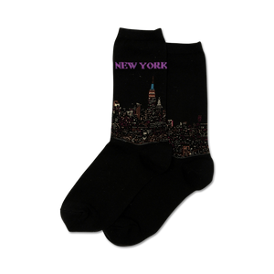 Black New York City skyline socks. These women's crew socks feature a vibrant pattern of the iconic New York skyline. The bright colors and bold design create a fun and stylish look that's perfect for any New York fan. From the Empire State Building to the Statue of Liberty, these socks have it all. You'll feel like you're walking through the streets of the Big Apple every time you put them on. Socks have reinforced toes and heels for added durability and a comfortable fit.