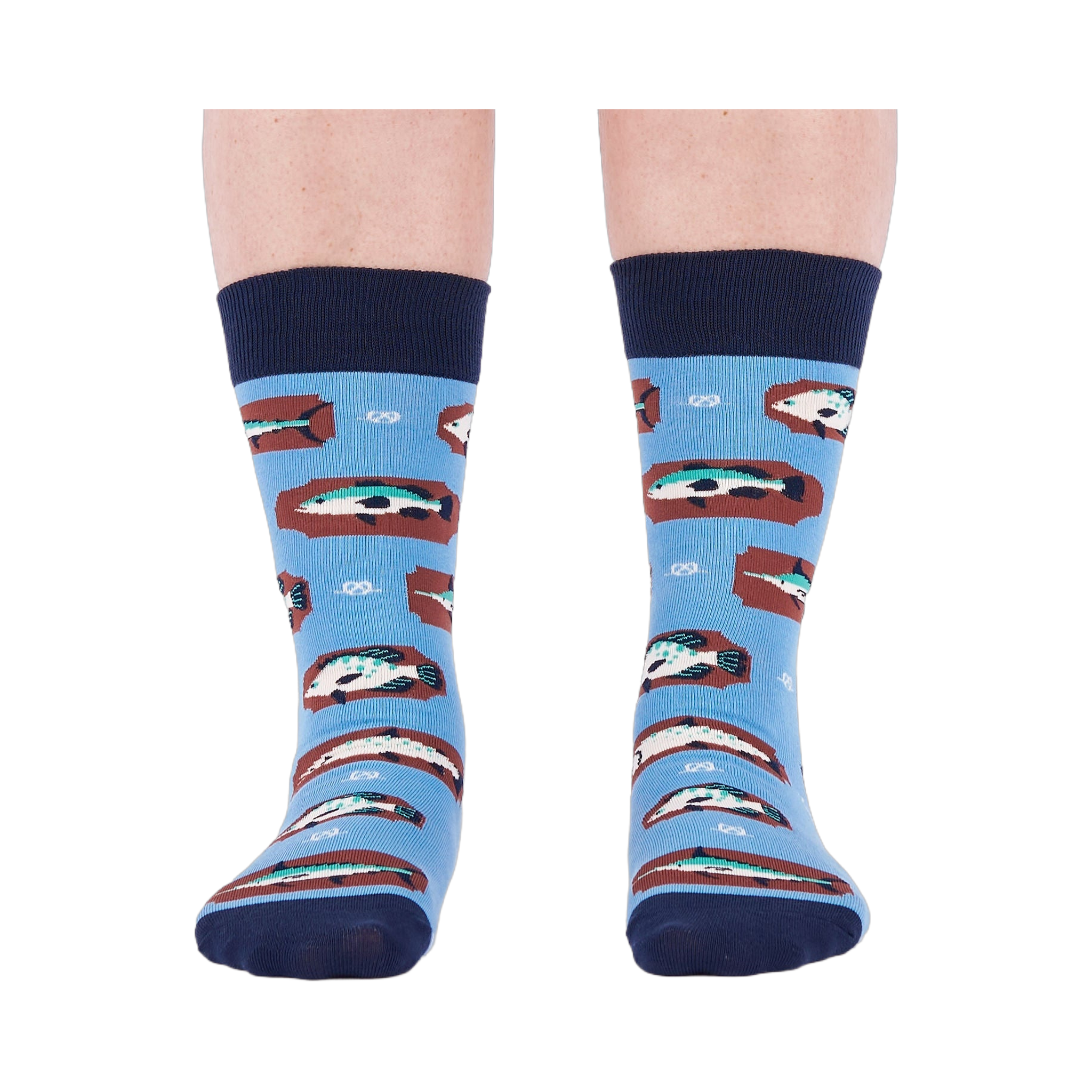 The crew length gives them a classic fit that sits comfortably with boots, sneakers, or relaxed office shoes. The design is bold enough to stand on its own, but still neat enough to keep the rest of an outfit grounded. For anyone who likes fishing, fish, or just a good visual joke that does not try too hard, these socks bring personality without turning the volume all the way up.