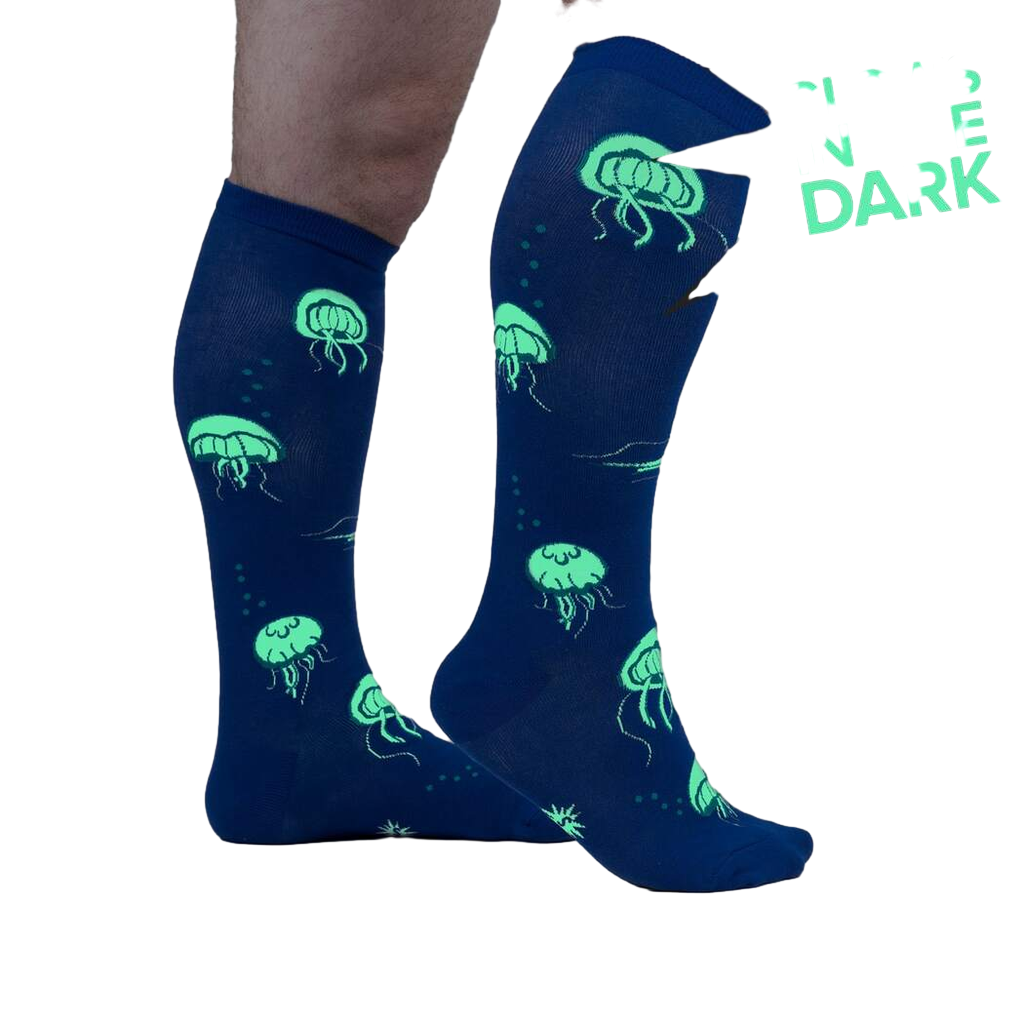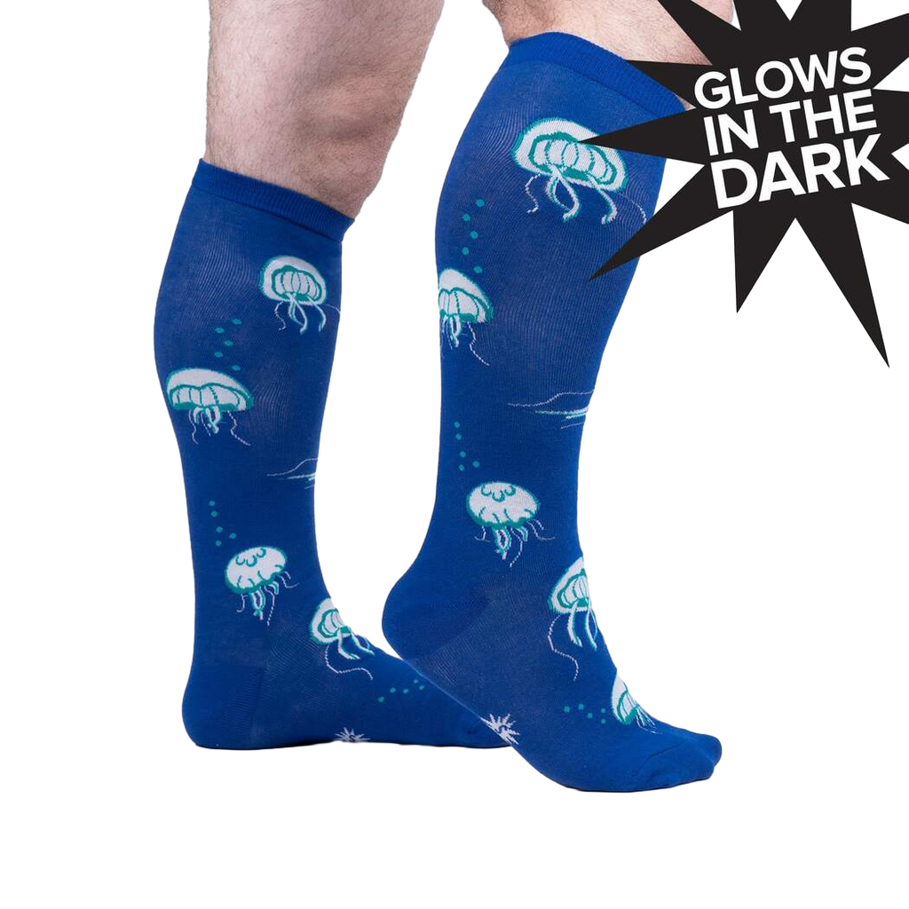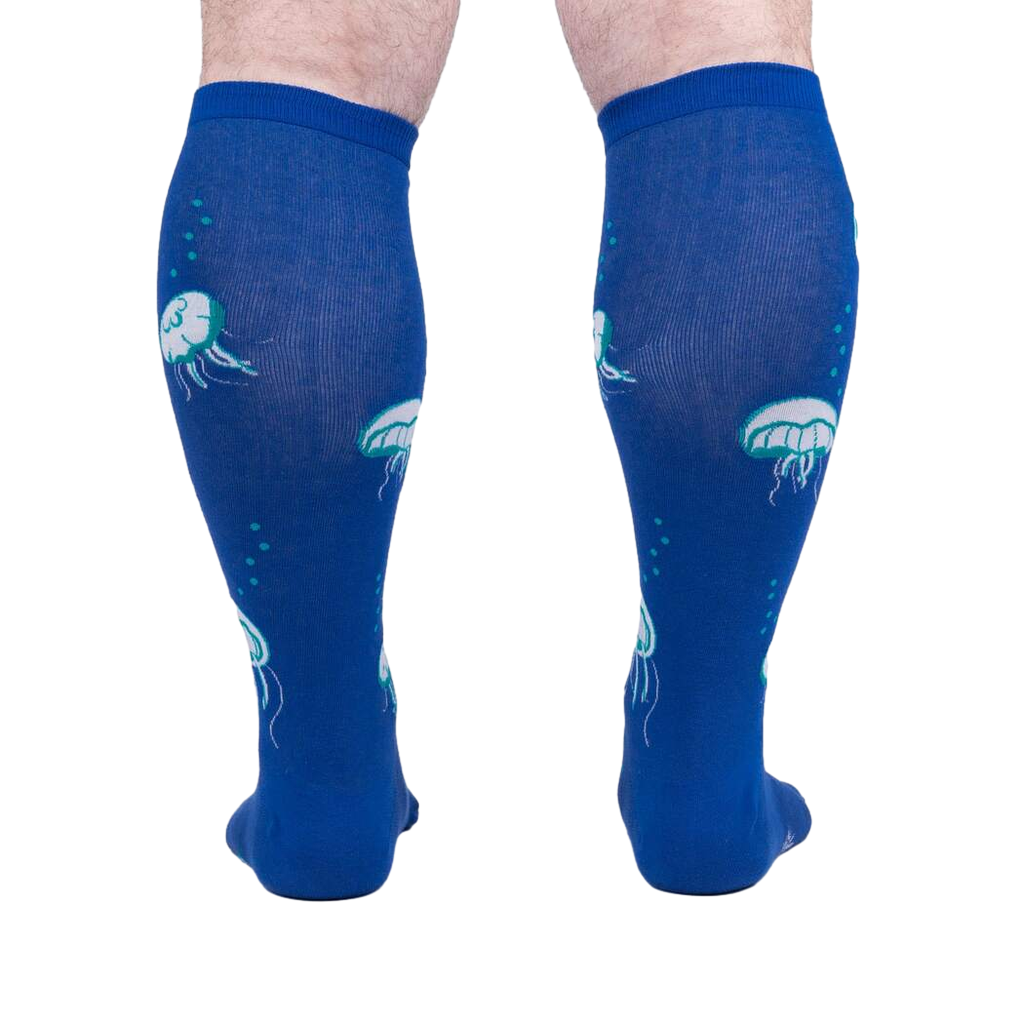 Dive into nautical bliss with our Nice to Sea You knee-high socks! Featuring a delightful all-over pattern of jellyfish in white with green and blue accents on a baby blue background, these socks will make a splash wherever you go. Perfect for men and women with wide calves, these socks bring a touch of marine magic to your wardrobe. From pool parties to beachy getaways, these socks are sure to be the catch of the day.!