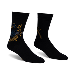 These black crew socks bring a bit of nighttime mystique to your feet. One side of each sock features the distinct profile of a black cat, its head turned, with bright yellow-gold eyes that really stand out. Its fur is detailed with a cool mix of gold and blue lines, giving it a luminous, almost electric look against the dark background. Scattered around the visible cat are small, glowing yellow dots, like tiny stars in a night sky. The patterns shown on the other side of the socks display abstract streaks and dots of gold, hinting at a trailing, cosmic effect. They're a subtle nod to the quiet magic of the night.