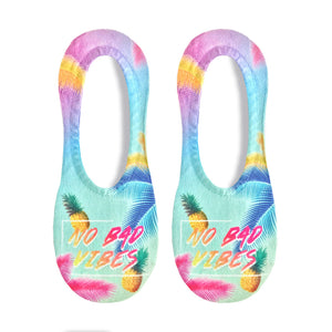 No Bad Vibes Summertime Fun: Kick off your summer with these effervescent liner socks featuring a sprightly palm leaf and pineapple pattern against a crisp white backdrop. These socks will liven up any outfit and remind you to embrace the sunshine mindset. Strut your stuff and spread positivity wherever you go with the No Bad Vibes socks.