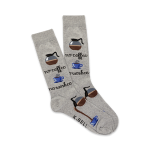 Start your day off on the right foot with our No Coffee No Workee socks! These gray crew socks are adorned with a fun pattern of coffee pots and coffee cups, and the text "No Coffee No Workee" is proudly displayed on each sock. Perfect for the coffee lover in your life, these socks are the perfect way to show your love for your morning cup of joe, and to add a touch of fun to your daily wardrobe. Whether you're at work, at home, or just running errands, these socks will make you smile and give you a boost of energy. So next time you're feeling groggy, reach for a pair of No Coffee No Workee socks and let the caffeine do its magic!