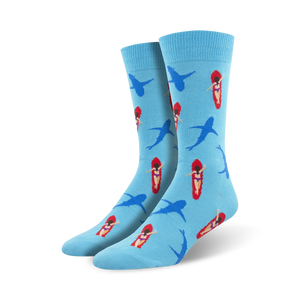 Cowabunga! Ride the waves of style with our "No Lifeguard on Duty" socks. These blue crew socks feature a radical pattern of women in red bikinis surfing alongside hungry sharks. Catch a wave of compliments every time you wear them. They'll make you the gnarliest woman on the beach, even if you can't hang ten.