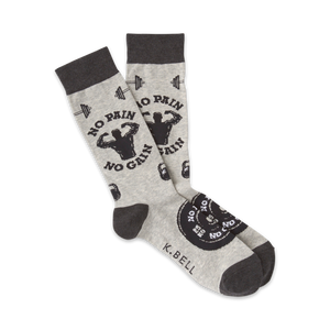 Go hard or go home! Hit the gym in style with a fresh pair of motivation. This cool pair of gray crew socks features a muscle man silhouette with the phrase "No pain No gain" around him. On the top of the foot is a black weight plate. With these socks you'll be making all kinds of gains!