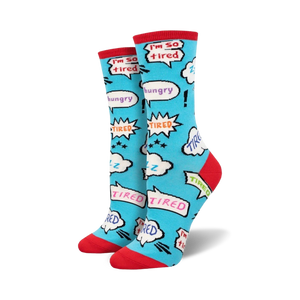 So you're feeling a little tired and grumpy? No Rest For The Wicked socks can totally relate! With their bright blue background, colorful speech bubbles that say "I'm so tired," "hungry," "tired," and "zzz," and a red toe and heel, these socks will let the world know how you're really feeling - without you having to say a word. These funny, comfy crew socks are perfect for women, and they're sure to bring a smile to your face, even on your grumpiest days.