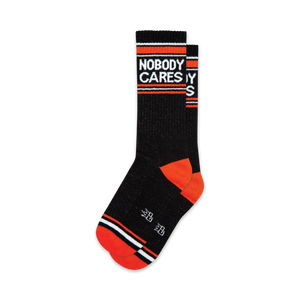 Sock it to 'em with these hilarious and edgy Nobody Cares Gym socks! These black crew socks feature a bold white stripe and eye-catching orange stripe, along with the words 'Nobody Cares' emblazoned across the front in a no-nonsense all-caps font. Perfect for those who appreciate a touch of sarcasm and humor in their everyday style. Whether you're hitting the gym, running errands, or just lounging around, these socks are sure to get a chuckle from anyone who sees them.