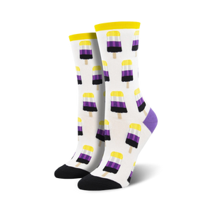 Calling all popsicle lovers and non-binary pride supporters! These Non-Binary Pops socks are serving up a refreshing reminder that even the subtlest hues can pop. With their vibrant purple, black, and yellow popsicles dancing across shimmering white socks and a sweet purple toe, heel, and cuff combo, these crew-length wonders will have you feeling fruitylicious from your feet up. And when you catch a glimpse of those toes poking out from your kicks, you'll be chanting in unison: "LGBT-Popsicles, we're proud, we're queer, we wear our colors loud and clear!"