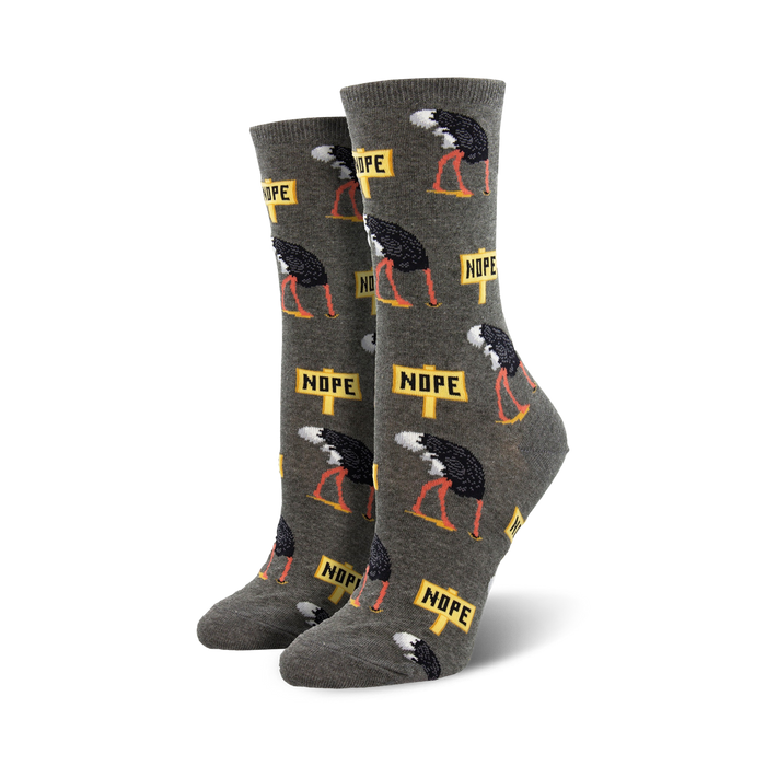 Meet "Nope" the ostrich, the new crew length sock designed for women that'll bury its head in sand instead of your feet. With a striking pattern of black ostriches in yellow sand, these socks have "NOPE" signs posted all over. Fun socks will keep reminding you to put your best foot forward, even when life tries to bury your head!