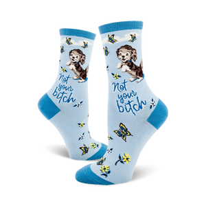 Not Your Bitch Puppy Dog socks are like a walk in the park on a sunny day. Blue socks bloom with white and yellow flowers and yellow and orange butterflies while a brown and white cartoon pup on each foot reminds you that you're your own best friend. Show off your independence with these vibrant novelty socks and strut your stuff 'cause these socks belong to you and you only.