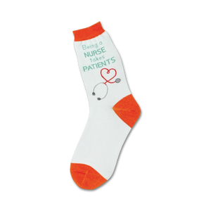 These "Nurse: Being a Nurse takes PATIENTS" socks are the perfect way to bring some fun and lightheartedness to your workday. Featuring a bright orange stethoscope with a red heart in the middle, and the words "Being a Nurse takes PATIENTS" in blue and green, these socks are sure to put a smile on your face and the faces of your patients. So next time you're feeling the stress of the job, just look down at your feet and remember, you've got this!