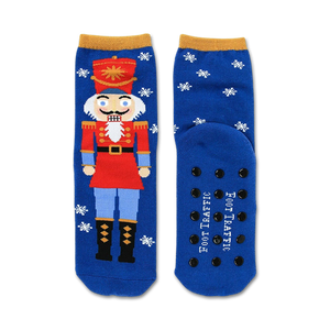 Tis the season to put on your dancing shoes! Slip into these Nutcracker Non-Skid Slipper socks and feel like you're right there in the Land of Sweets with Clara and the Nutcracker Prince. The blue background is adorned with nutcrackers in patriotic outfits, snowflakes, and gold stars. The non-skid sole ensures you won't take a tumble while you're dancing the night away. These slipper socks are perfect for lounging around the house or running errands. They're sure to put you in the holiday spirit!