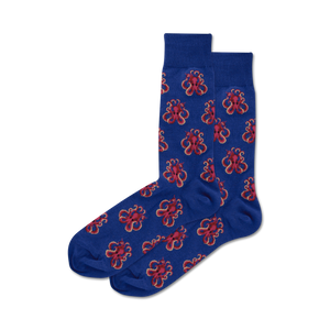 Get ready for an OCTO-PUNCH of fun with our Octopus Crew Socks! Mens blue crew socks featuring a lively pattern of red octopuses are the perfect way to add a touch of sea-rious style to your wardrobe. Slip into these sock-tacular creations and let your feet take a vacation to the deep blue sea!