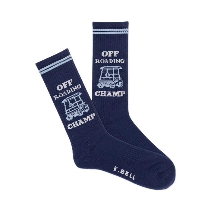 Off Roading Champs! Bold blue socks with eye-catching white stripes feature a golf cart and the slogan 'Off-Road King', declaring you a pro when you're golfing. Show off your active lifestyle, even when you're just practicing your putting!