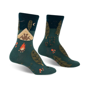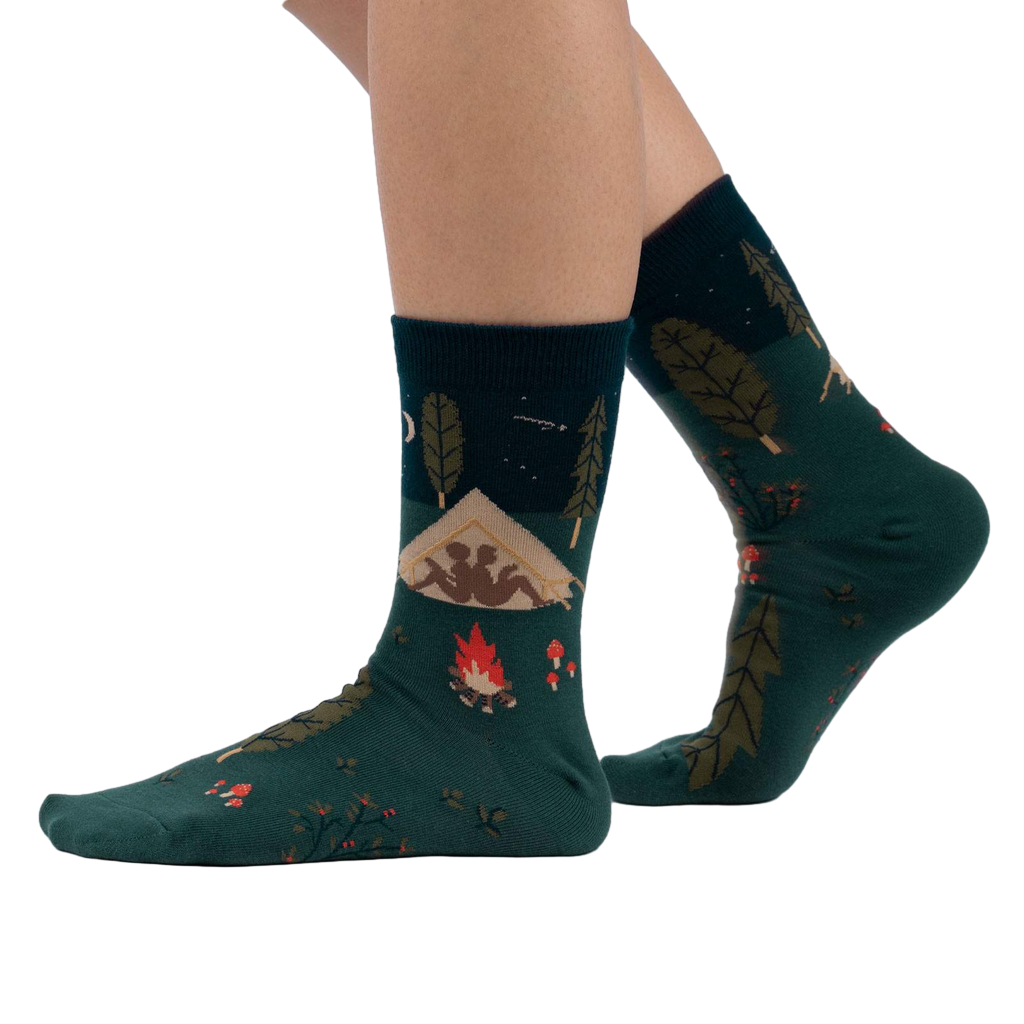 Ready for an adventure? Off The Grid crew socks are like a camping trip for your feet! They feature an all-over pattern of pine trees, tents, campfires, mushrooms, leaves, and starry skies. These fun socks for women are the perfect way to add a little bit of the outdoors to your everyday style.
