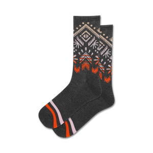 Ombre Geo socks: A classic geometric pattern fades from orange to pink at the top of these gray crew socks. The subtle ombre effect adds a hint of whimsy to any outfit, making them the perfect socks for adding a touch of personality to your everyday look.