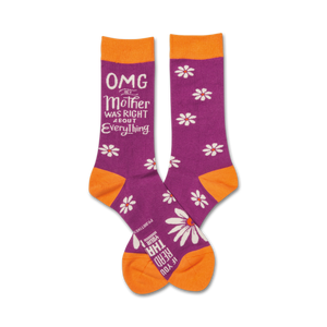 "OMG My Mother Was Right About Everything" novelty socks make a hilarious Mother's Day gift! Show Mom you're listening and let her know she is always right, even when she is not! These white, purple, and orange crew socks feature the playful text and flower print, and are guaranteed to put a smile on Mom's face. Made in the USA with cotton, nylon, and spandex. Women's size 5-10.