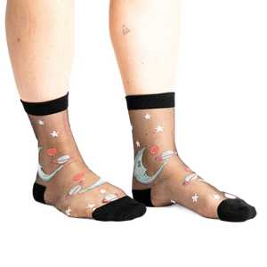 Ever noticed how the night sky tells a million stories? With our sheer moon socks, each step feels like a journey through a star-studded sky. These celestial wonders offer a delightful nod to retro vibes, perfect for those who appreciate a nostalgic twist in their fashion repertoire. Whether you're pairing them with bold platform sandals or your favorite sneakers, these socks are your ticket to a whimsical style adventure.