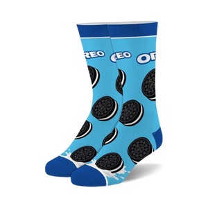 Put your feet inside a delectable dessert with these Oreo Crew Socks! Experience the iconic black and white cookie design you know and love on a cheerful blue backdrop. These comfortable and durable socks are a perfect treat for any Oreo enthusiast. Satisfy your cravings in style without the calories.