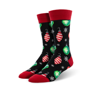 Ornaments socks for him: Soft and cozy mens crew socks that let your feet get in the holiday spirit. These festive knit socks feature an array of holly-jolly ornaments against a black backdrop.