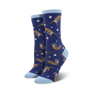 Otter Space socks: Ready for lift off. These cosmically cute socks feature a cartoony crew of space-faring otters. The bright blue background is sprinkled with stars, planets and galaxies. All aboard! These socks will make paws-itively stellar stocking stuffers and are the purr-fect gift for women who love space and otters. They're out of this world!